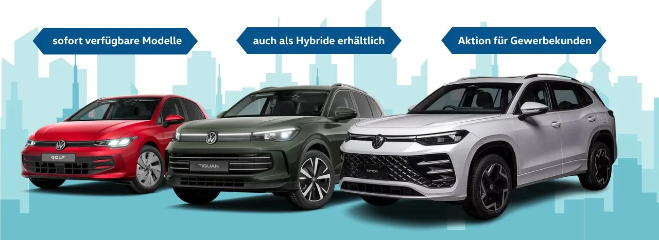Starten Sie mit Ihrem Unternehmen direkt durch: Der Volkswagen Golf, Tiguan und Tayron stehen sofort verfügbar für Sie bereit – ohne lange Lieferzeiten. Alle Modelle sind auf Wunsch auch als effiziente Plug-in-Hybride erhältlich und verbinden elektrisches Fahren im Alltag mit voller Flexibilität für längere Strecken. Profitieren Sie jetzt von attraktiven Konditionen und sichern Sie sich Ihren FAST START ins Geschäftsjahr 2026.