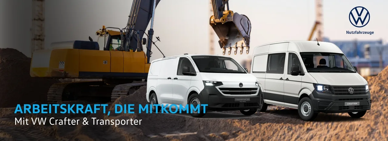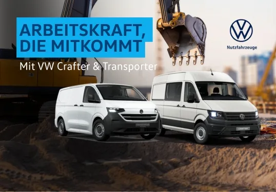 Sichern Sie sich den nächsten großen Auftrag: Mit dem VW Crafter und Transporter sind Sie flexibel und robust im nächsten Einsatz – enormer Ladevolumen, Allrad-Power für matschige Baustellen und bei uns verfügbar.